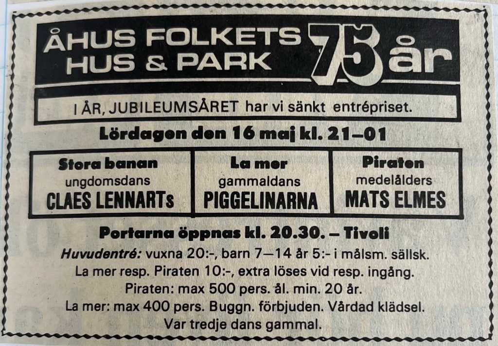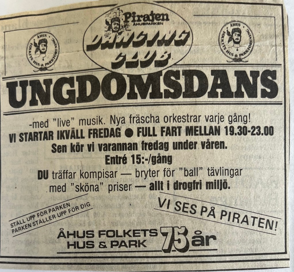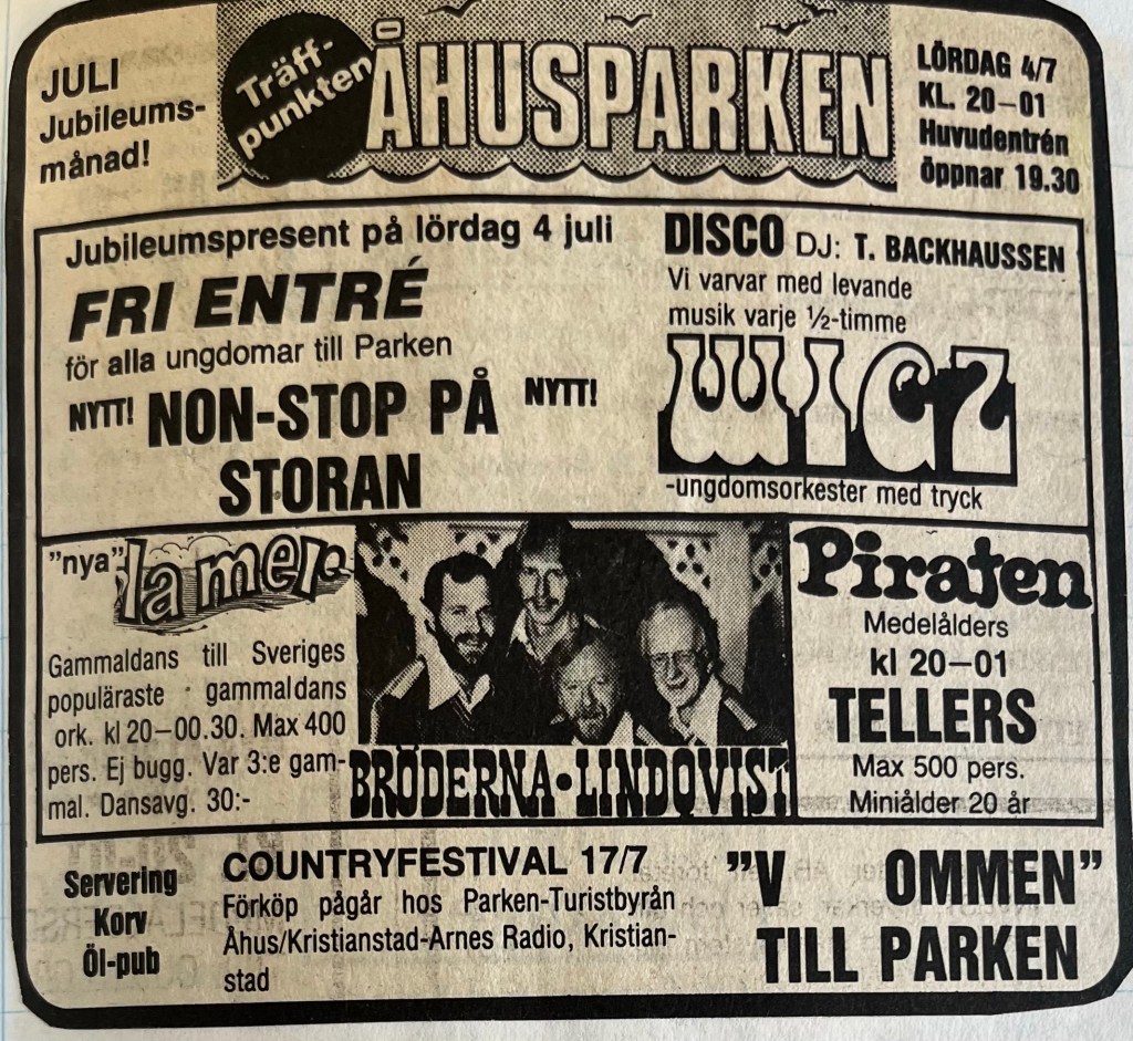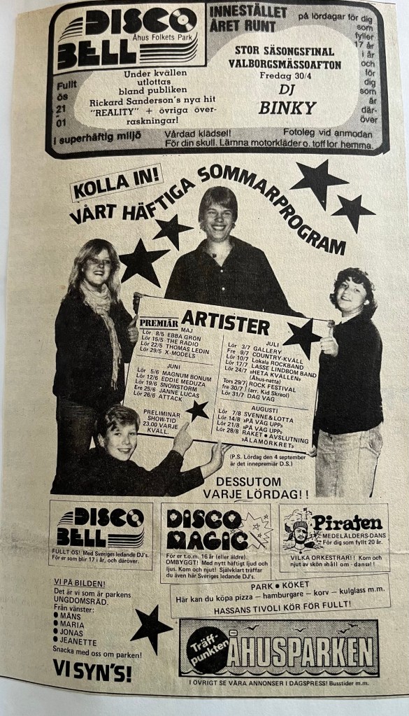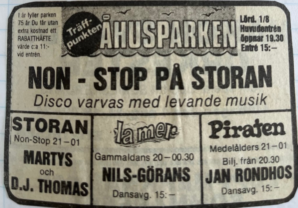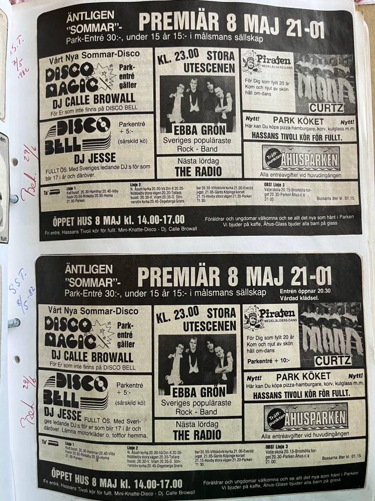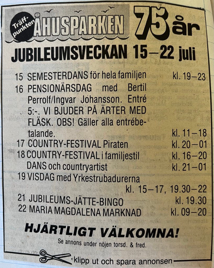 V OMMEN på! Och några annonser där några bokstäver hänger på sned i ordet VÄLKOMMEN! Eleverådet från Sånnaskolan arrangerade disco under vintertid. 1982 bildade parken ett ungdomsråd med Maria Anderberg i spetsen. Åhusparken firade 75 år 1981 vilket också uppmärksammades i annonserna. Klicka på bilderna för att se de i full bredd.