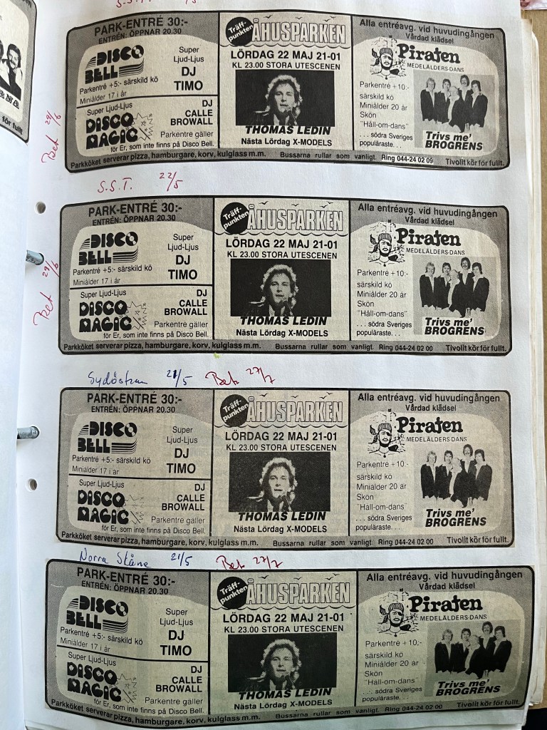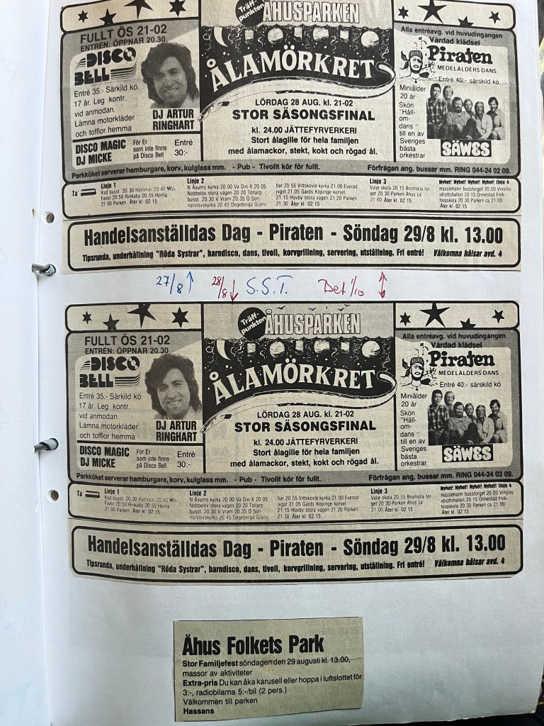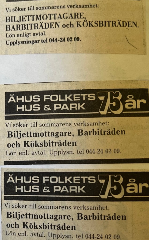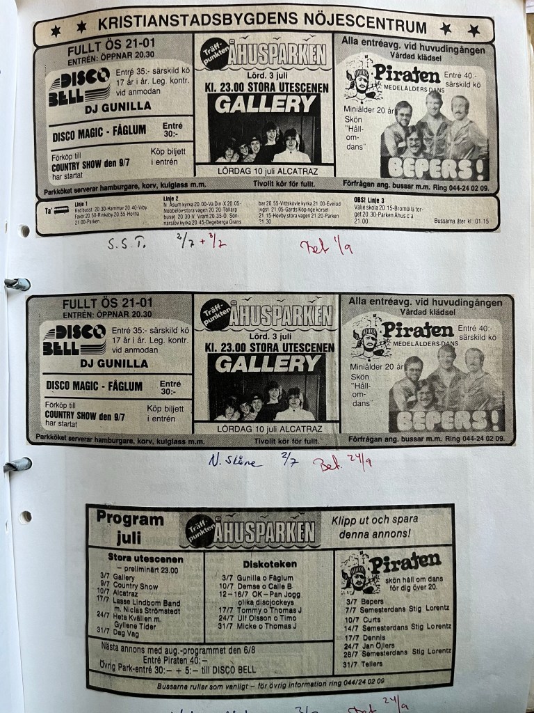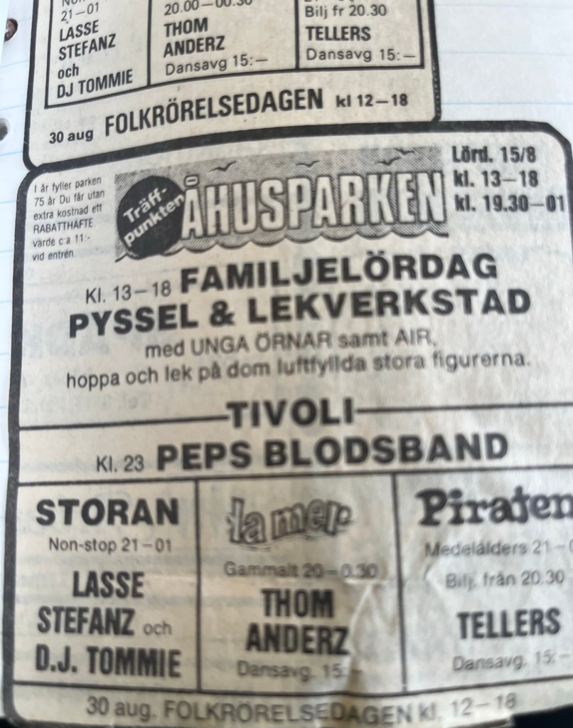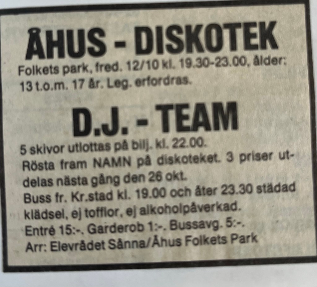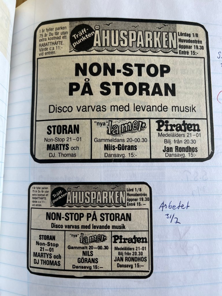 V OMMEN på! Och några annonser där några bokstäver hänger på sned i ordet VÄLKOMMEN! Eleverådet från Sånnaskolan arrangerade disco under vintertid. 1982 bildade parken ett ungdomsråd med Maria Anderberg i spetsen. Åhusparken firade 75 år 1981 vilket också uppmärksammades i annonserna. Klicka på bilderna för att se de i full bredd.