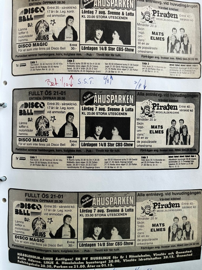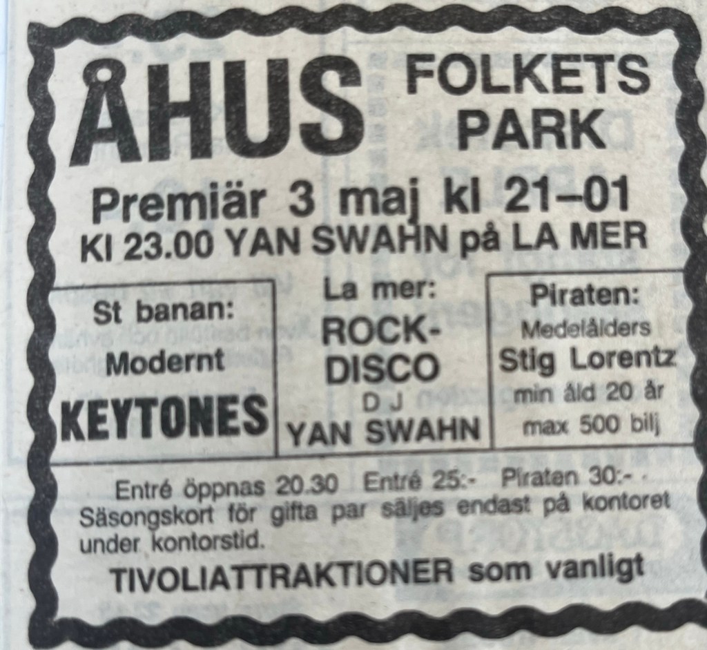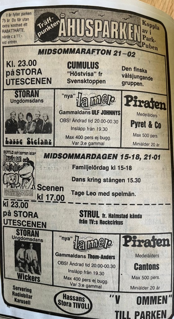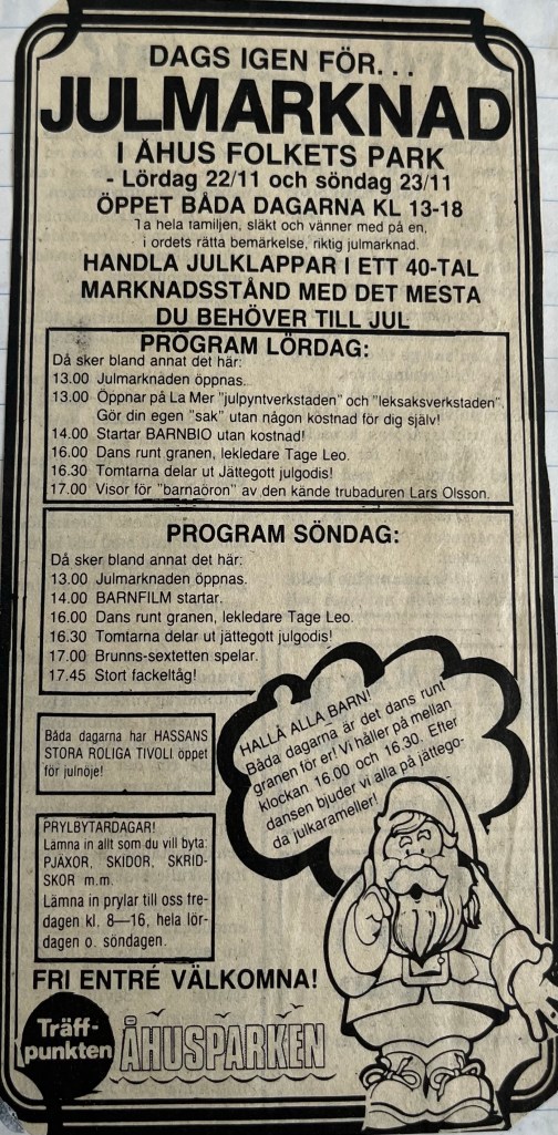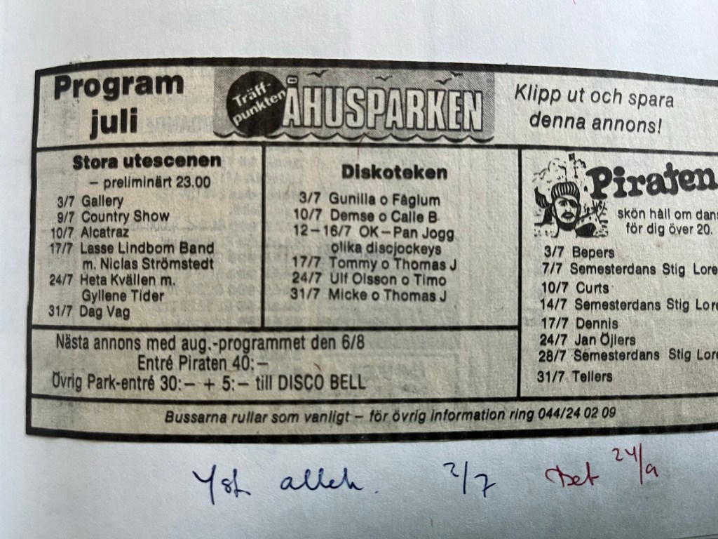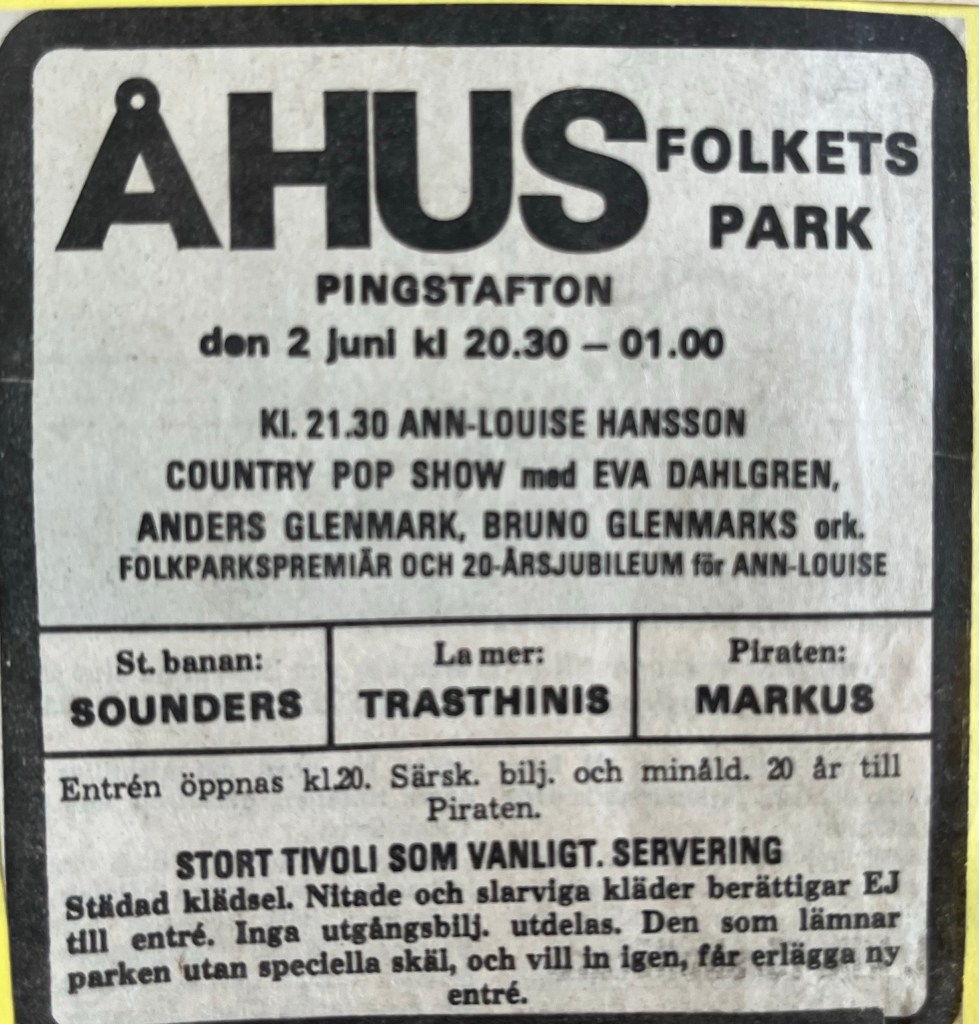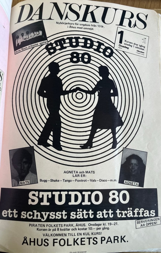 V OMMEN på! Och några annonser där några bokstäver hänger på sned i ordet VÄLKOMMEN! Eleverådet från Sånnaskolan arrangerade disco under vintertid. 1982 bildade parken ett ungdomsråd med Maria Anderberg i spetsen. Åhusparken firade 75 år 1981 vilket också uppmärksammades i annonserna. Klicka på bilderna för att se de i full bredd.