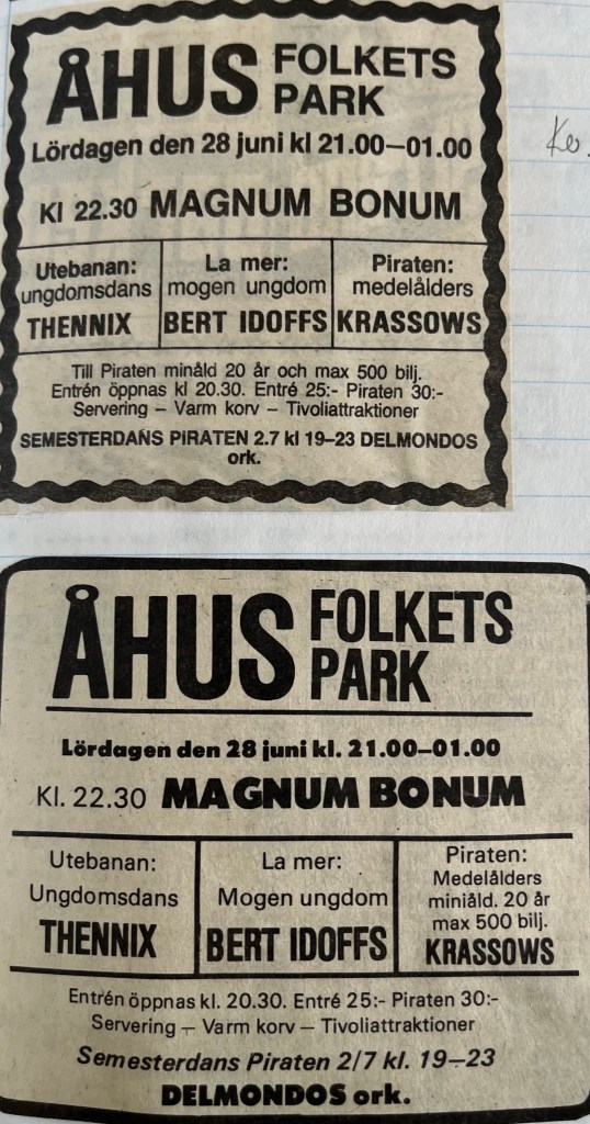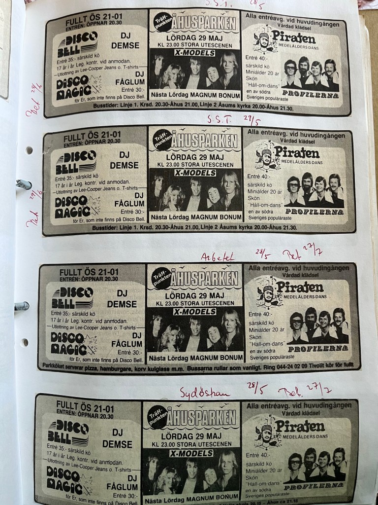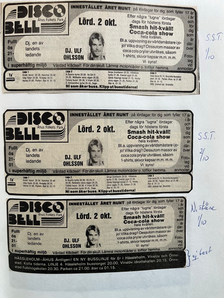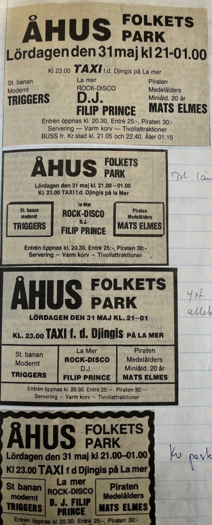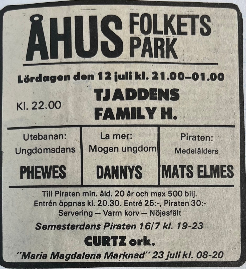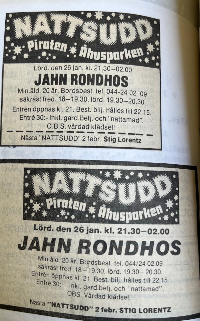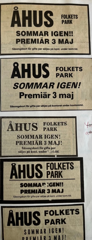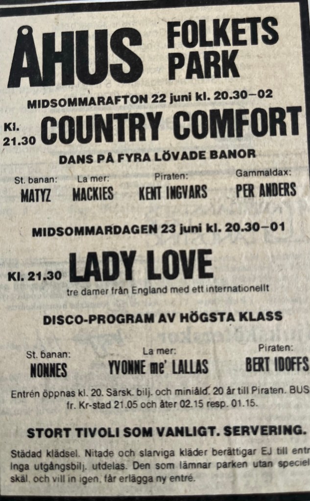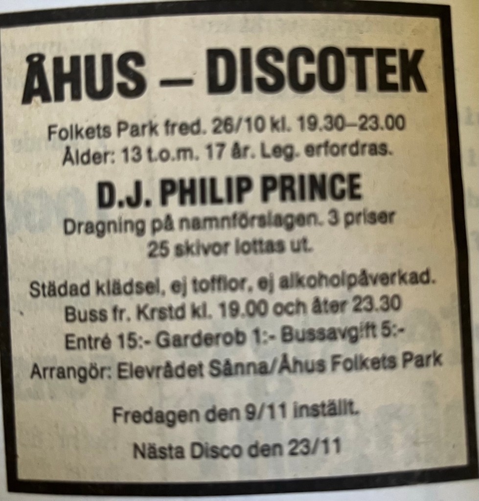 V OMMEN på! Och några annonser där några bokstäver hänger på sned i ordet VÄLKOMMEN! Eleverådet från Sånnaskolan arrangerade disco under vintertid. 1982 bildade parken ett ungdomsråd med Maria Anderberg i spetsen. Åhusparken firade 75 år 1981 vilket också uppmärksammades i annonserna. Klicka på bilderna för att se de i full bredd.